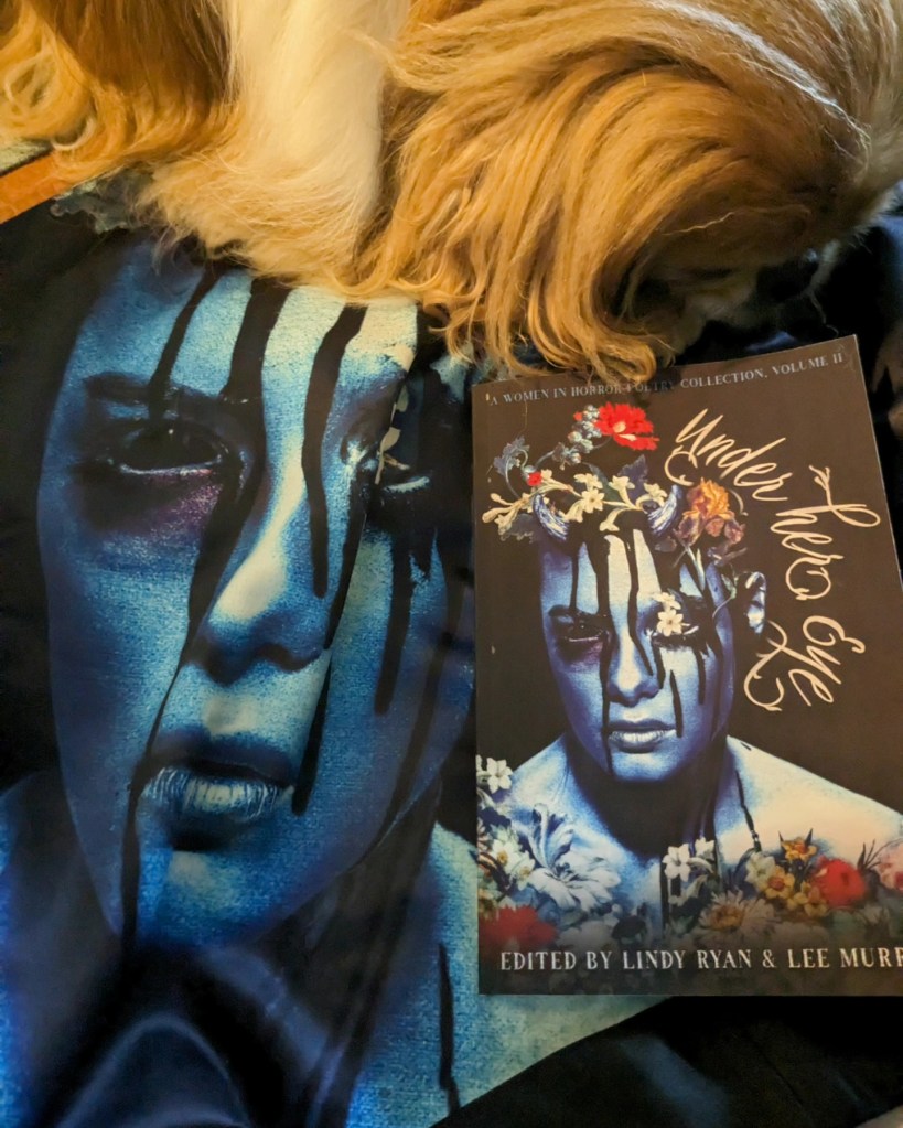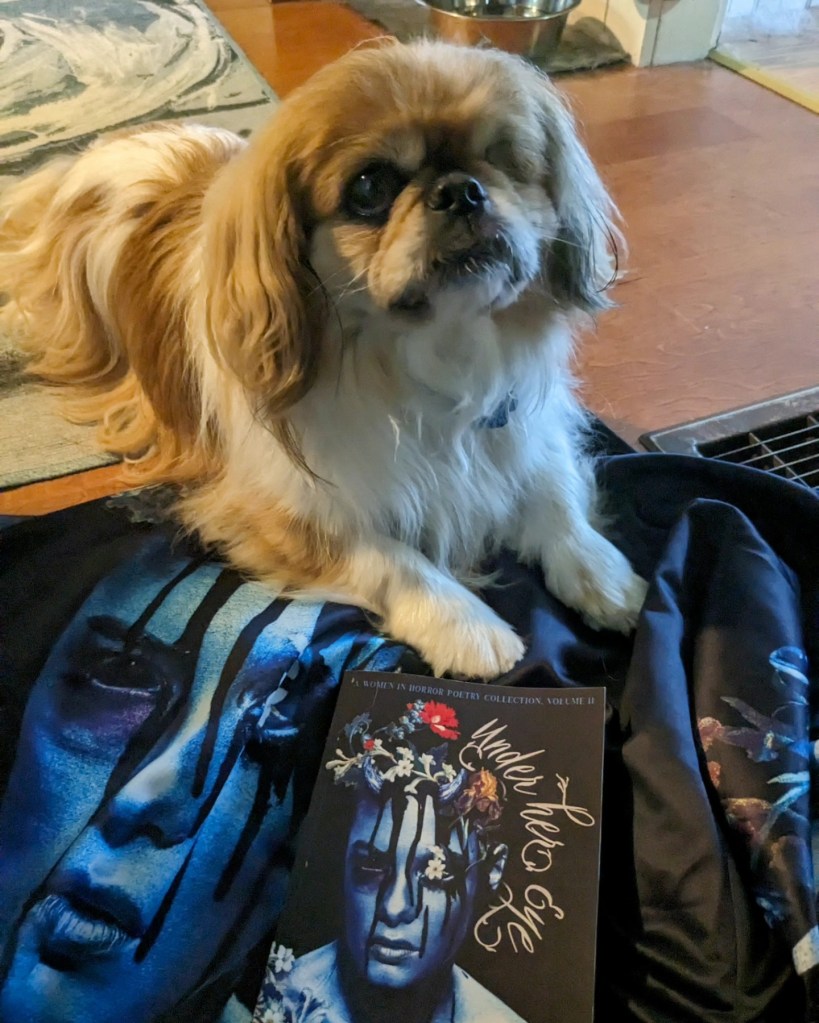 Contributor copy day! Tried to take a fancy picture but Hamlet kept photo bombing it! Thank you to Lindy Ryan, Lee Murray, and Black Spot Books. Cover art and fantastic kimono by Lynne Hansen! This book is produced in partnership with The Pixel Project, a global non-profit organization focused on ending violence against women globally.