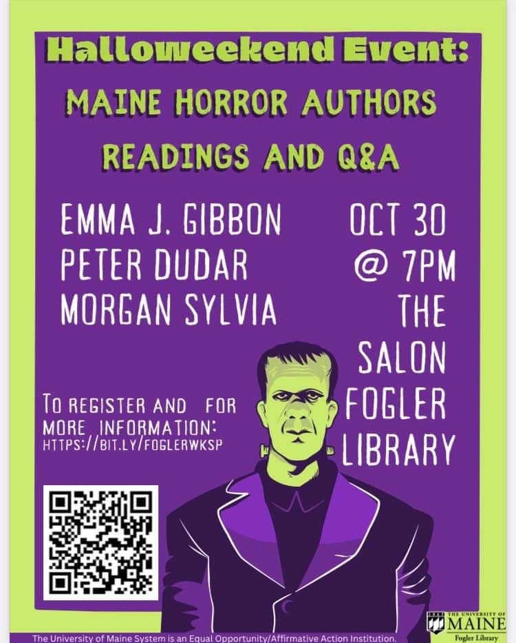 On Monday, members of my writing group, the Tuesday Mayhem Society, Peter N. Dudar, Morgan Sylvia and I, went up to Orono, Maine to do an event at the Fogler Library at the University of Maine. We had a fantastic time. We can’t thank the library staff and audience members enough for such a magical (and spooky) time. Here’s the fantastic poster that was around campus:
