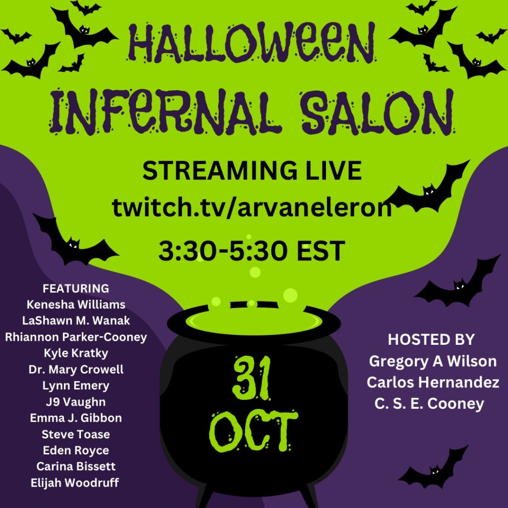 On the day itself, I took part in my second Infernal Salon, hosted by the lovely C.S.E. Cooney and Carlos Hernandez, and streamed on Twitch by Arvan Eleron. For Halloween, it was suitably scary for participants, as they wrote and read pieces LIVE based on prompts from the hosts’ tabletop rpg Negocios Infernales (which you can still back on Kickstarter). Here’s the list of the intrepid Salon-ers: